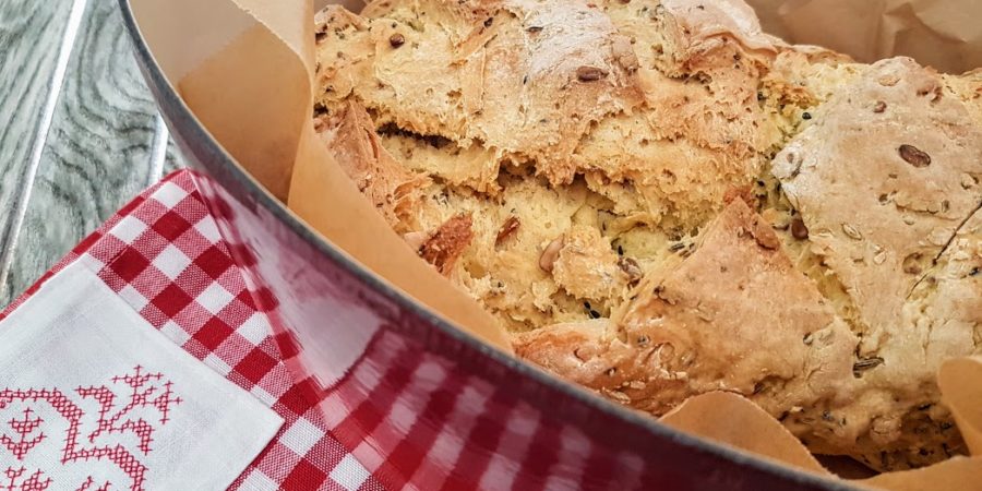 26 ième jour de confinement. C’est officiel, j’ai transformé ma cuisine en boulangerie….brioche, pain au lait, buchty, yaourt maison, flan…Je peux sans conteste animer une vitrine de pâtissier-boulanger…Je bénéficie comme plusieurs d’entre nous d’un luxe inouïe…du temps. Mais comme j’ai des envies de jardinage, de peinture, lecture, et que cultive comme une femme qui se respecte la contradiction. J’ai opté pour un pain sans pétrissage. Sa cuisson dans une cocotte, qui forme une étuve, en fait un pain croustillant, facile à confectionner, et donc à la portée de tous.