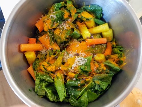 Déposer sur le lit d’oignon les légumes découpés en dés (pommes de terre, navets, carottes) placer sur le dessus poulet puis couvrir avec les feuilles d’épinards et le céleri ciselé.