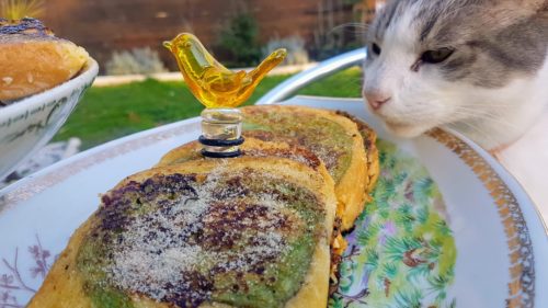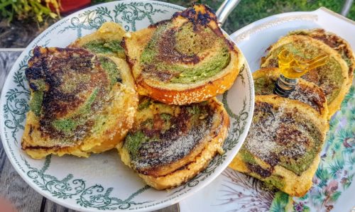 Une brioche au thé matcha laissée une semaine pleine sur le plan de travail pour qu’elle sèche bien. Un samedi très frisquet, pour le goûter, j’ai emprunté la recette, simplissime comme toujours, du charmant et talentueux Cyril LIGNAC. Nous nous sommes régalés avec cette brioche façon pain perdu. Saupoudrez avec du sucre vanillé, qui caramélise légèrement, c’est tout bonnement un délice !
