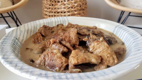 Ingrédients pour un boeuf stroganof pour 4 personnes : 500 g de rumsteck – 2 càcafé de paprika – 3 càsoupe d’huile d’olive – 2 oignons – 400 g de champignons de paris – 20 cl de crème liquide – sel et piment d’espelette – 20 cl d’eau
