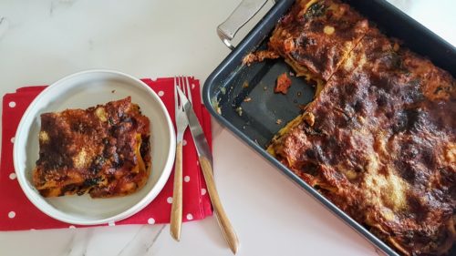 Les lasagnes j’en fait rarement, et quand c’est le cas, j’essaye de varier les épices, et alléger un maximum, l’ardoise calorique. J’ai eu la chance d’en dénicher des fraîches au marché, et franchement ça change tout au goût. Je les ai truffées d’une sauce tomate maison enrichie de branches d’épinard frais. J’ai parsemé de fromage brillat savarin fait gratiner, hum, quel régal !