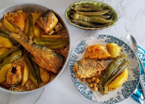 Le couscous connaît autant de variantes que d’individus le cuisinant. A chaque saison correspond son couscous avec les légumes sur les étals à ce moment là. il pourra être aromatisé au poulet, au poulpe ou comme ici au poisson. J’aime particulièrement celui au poisson, car il allie goût et diététique. Je vous livre ma recette, celle d’un couscous au mulet, mais vous pouvez choisir n’importe quel autre poisson qui aura vos faveurs.