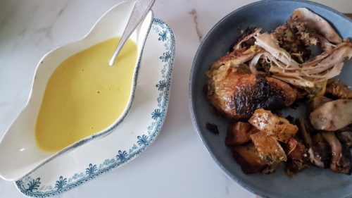 Si tu as envie de bichonner les tiens, que tu veux profiter du temps qui passe. J’ai ce qu’il te faut ami lecteur, 1/2 heure de préparation à consacrer à cette recette elle te le rendra au centuple, en saveurs… Alors Sors lui le grand jeu à ce poulet truffé sous la peau. Des pommes de terre qui vont cuire avec les sucs du poulet puis on le nappera avec une petite sauce. Et si le bonheur est aussi simple qu’un bon plat qui embaume en cuisant ?