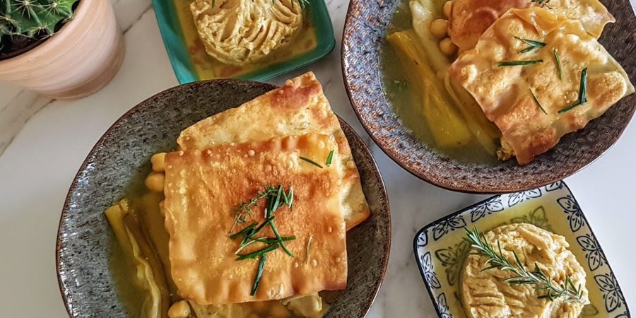 Sur la photo du dessus, est celle d’un plat dégusté dans un restaurant cet été durant mes vacances. Je l’ai reproduite une fois revenue à la maison. Ce plat est composé de poireaux cuits au four, d’une sauce dans laquelle auront mijoté les pois chiche. On grille un filet de poulet, on accompagne ce plat d’un bon houmous maison. Je pense que là le bonheur est dans le pré ! J’ai tellement apprécié ce plat, qu’aussitôt rentrée chez moi je l’ai reproduit à ma façon. Pour une version vegan il suffira de retirer le poulet des ingrédients.