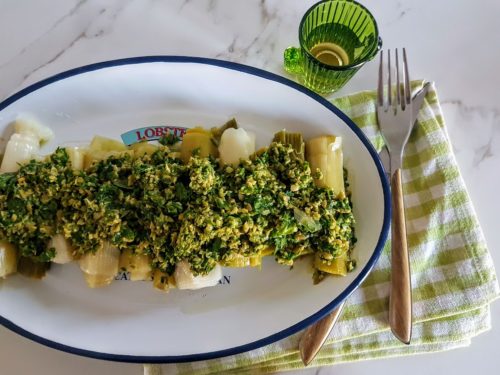Ranger mes livres a du bon, je redécouvre des pépites comme celui d’où j’ai tiré cette recette. J’avais en attente de transformation des poireaux. J’ai opté pour une cuisson douce au four, mais je mets les indications pour une cuisson classique à l’eau. Ils ont été nappés avec une sauce verte riche en goût avec des câpres, anchois, basilic, purée d’olives qui ont font une merveille gustative. A saucer avec un morceau de pain !