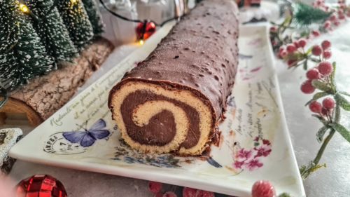 Cette année étant invitée pour le repas de Noël et comme nous serons une dizaine, j’ai opté d’apporter avec moi trois bûches, une à la crème de marrons, celle de Cyril LIGNAC façon forêt noire et celle-ci qui est vraiment facile. Une génoise garnie d’une ganache et recouverte de rochers suchard fondus. Je l’ai parsemé de pralin pour donner un croquant à l’intérieur mais même sans, cette bûche sera bonne. Si vous n’avez pas le coup de main pour la bûche enroulée, voici une recette pour vous, clic ICI.