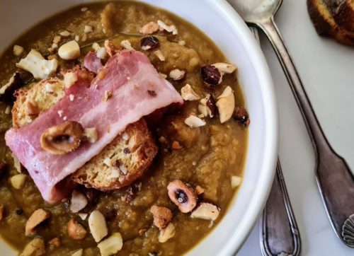 Tout dernièrement j’ai eu le plaisir de goûter chez une copine un vrai cordon bleu, un délicieux velouté. Je n’ai pas demandé la recette. Me fiant aux saveurs que j’avais décelées à la dégustation de son entrée. Un velouté onctueux sans une once de crème, des marrons pour un supplément de goût. Des noisettes pour le croquant et le fumet discret d’une ventrèche qui enveloppe du pain grillé. Vraiment un velouté qui change et absolument délicieux !