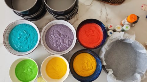 Pesez la pâte avant de la diviser en 6 parts égales de 260 g par génoise. Versez dans 6 bols avant de déposer la pointe d’un couteau de colorant en gel dans chaque. Mélangez.
