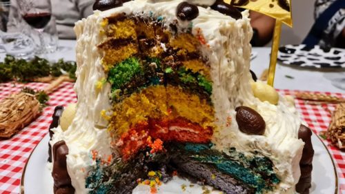 Un ami m’avait demandé d’apporter le dessert pour fêter ses 51 ans. L’an passé, j’avais confectionné un number cake et pour ce millésime, j’ai opté pour un rainbow cake. Il ne paye pas de mine, mais il a fait l’unanimité gustativement. J’ai parfumé la génoise avec de la fève tonka, j’ai mis dans sa composition de la poudre de noisettes. J’ai garni de ganache et recouvert d’une couche vanillée de cream cheese. Ce gâteau s’adresse à ceux qui cherchent une recette sans chantilly à monter.