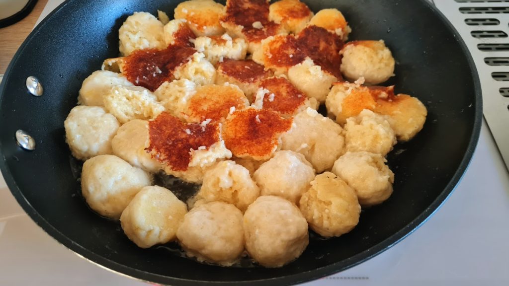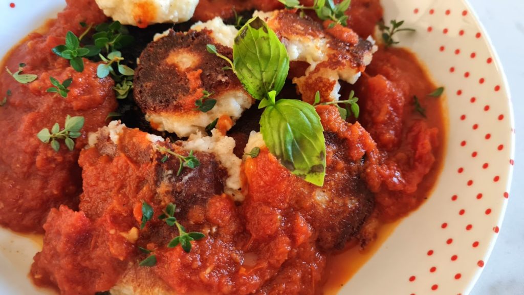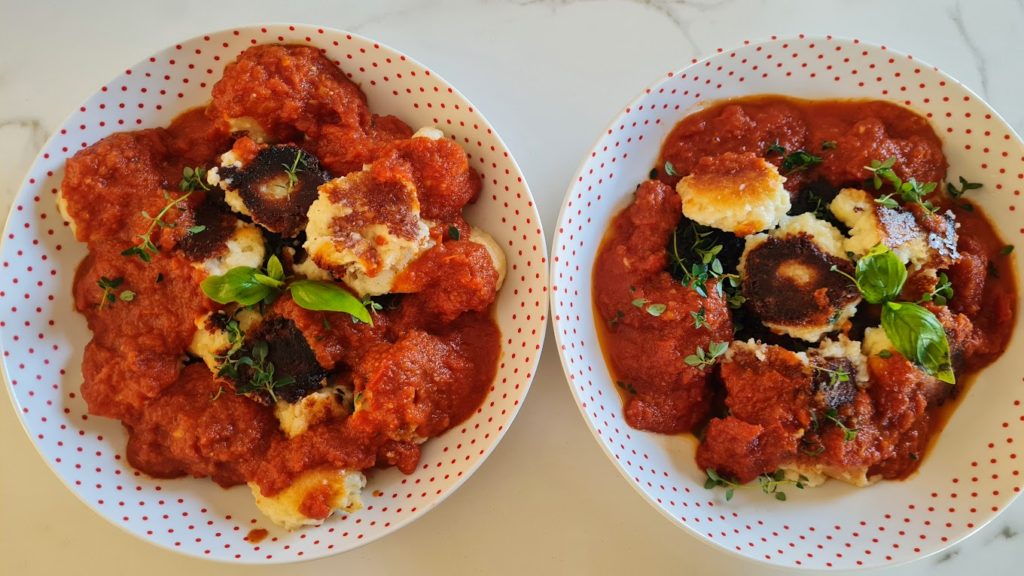 Pour un repas que je voulais rapide, j’ai opté pour des gnocchis au fromage frais. C’est une recette sans formalisme, puisque une fois la pâte prête, on forme des boules avant de les plonger dans l’eau. On les poêle, et on nappe généreusement avec une délicieuse sauce tomate maison. Un régal, vraiment vite fait.