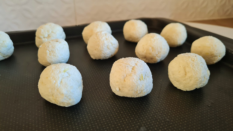 Prélevez un morceau de pâte environ 25 g et former une boule. Les déposer dans un grand plat en une seule rangée.