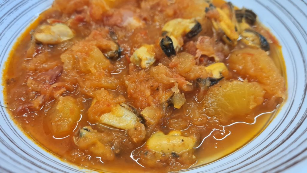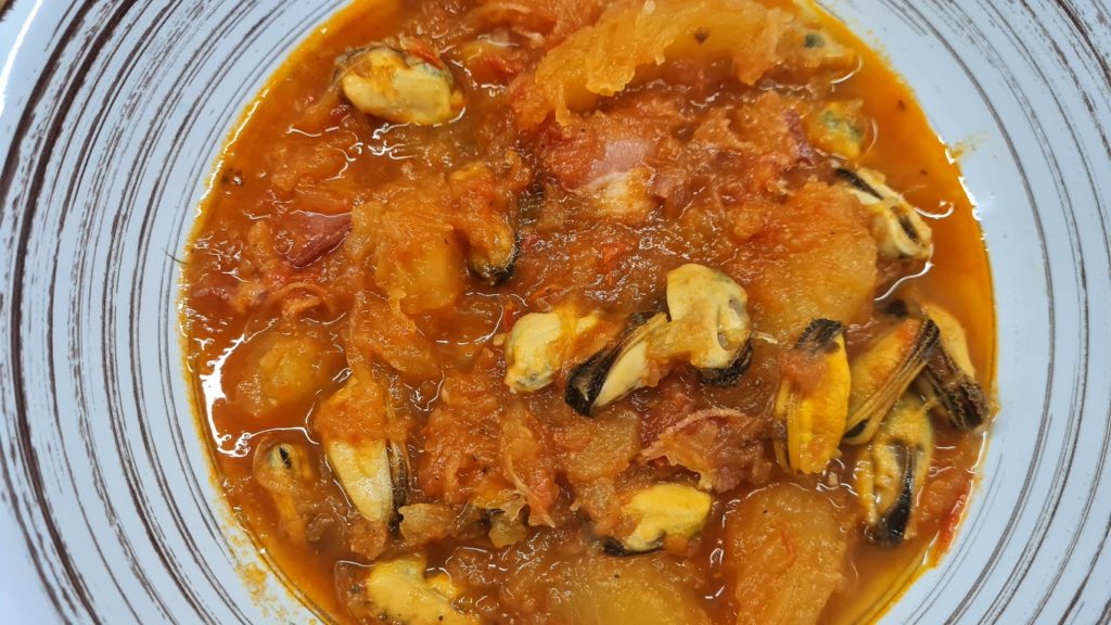 Ajoutez la chair de la courge, les épices (paprika, cumin, sel et poivre) ainsi que le cube de bouillon émietté. Versez le coulis de tomate et une partie de l’eau. Couvrir et laisser cuire pendant 20 minutes. Si à l’issue de ce temps, la sauce a bien réduite, rajoutez de l’eau s’il en manque. Puis déposez les moules décortiquées dans la sauteuse contenant le cucurbitacée. Poursuivre la cuisson pendant encore 10 minutes.