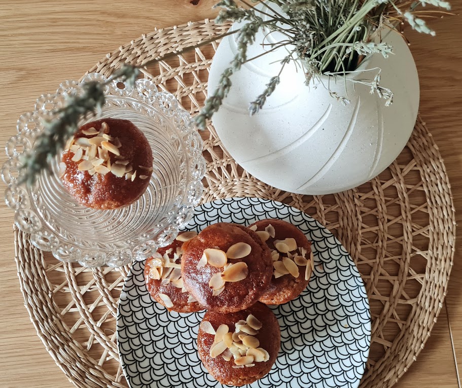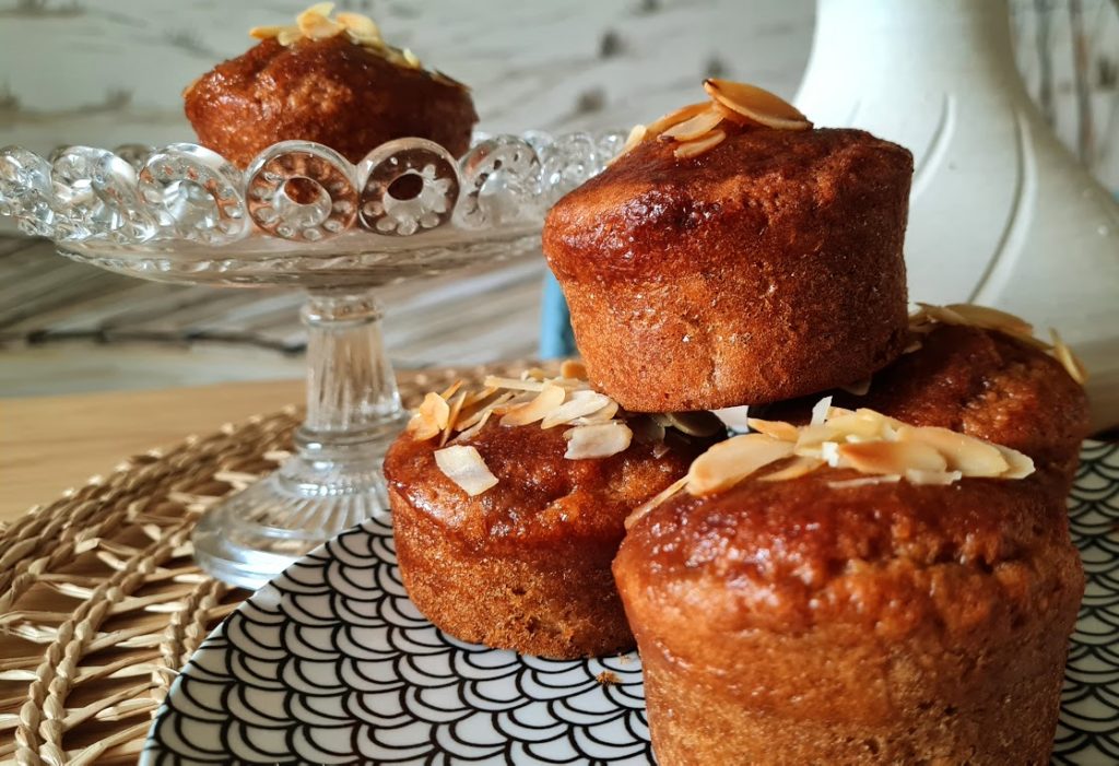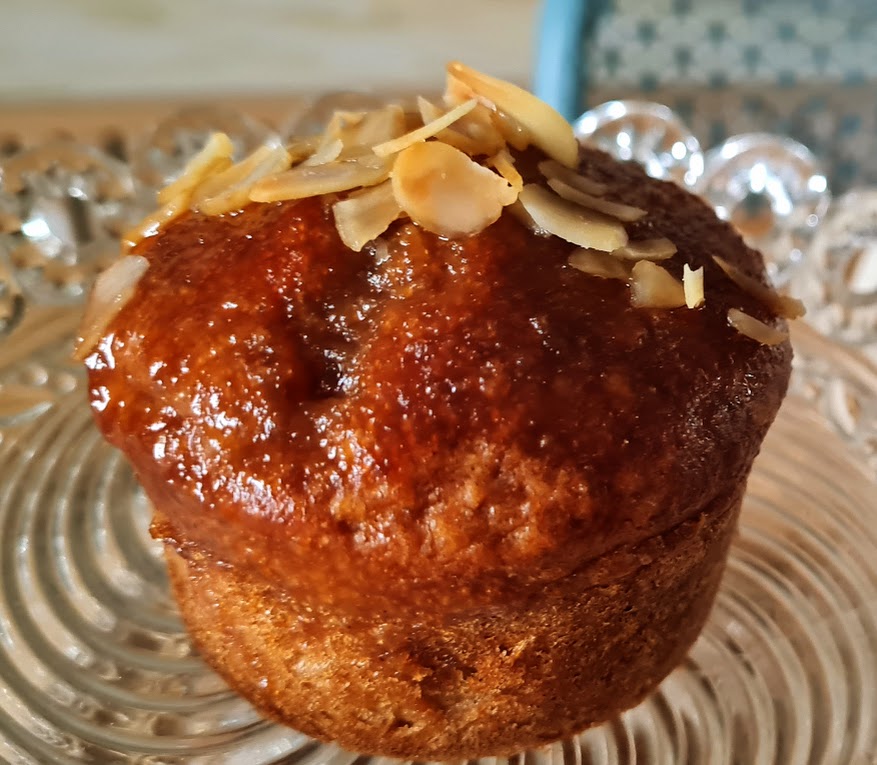 PS : A la sortie du four, j’ai lustré mes muffins avec une gelée de poires et j’ai rajouté des amandes effilées pour plus de gourmandise.
