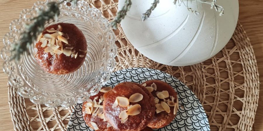PS : A la sortie du four, j’ai lustré mes muffins avec une gelée de poires et j’ai rajouté des amandes effilées pour plus de gourmandise.