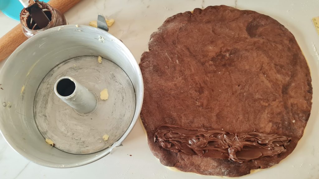 Une fois la pâte enroulée à moitié, la découper avec un couteau ou roulette, la torsader et continuer d’enrouler l’ensemble de la pâte. Déposez le pâton dans un moule style savarin ou comme le mien un moule à chiffon cake.