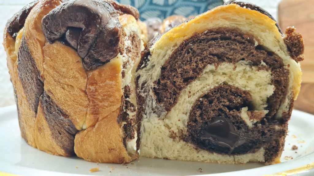 Lorsque la brioche est découpée à la sortie du four, le chocolat dégouline, mais lorsque la brioche refroidit, le chocolat fige.