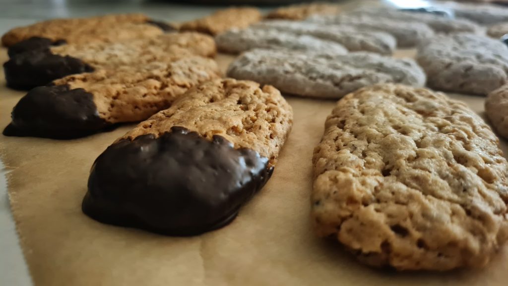Si vous optez de tremper un des bords avec du chocolat : environ 150 g de chocolat ménager et 3 càsoupe d’huile de tournesol, faire chauffer au bain marie