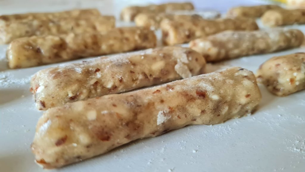 Filmer puis conserver la pâte au frais pendant une heure. A l’issue de ce temps, sortir la pâte diviser en deux et former un boudin sur la longeur et sur 1 cm environ d’épaisseur. Découpez des tronçons de 6 cm.