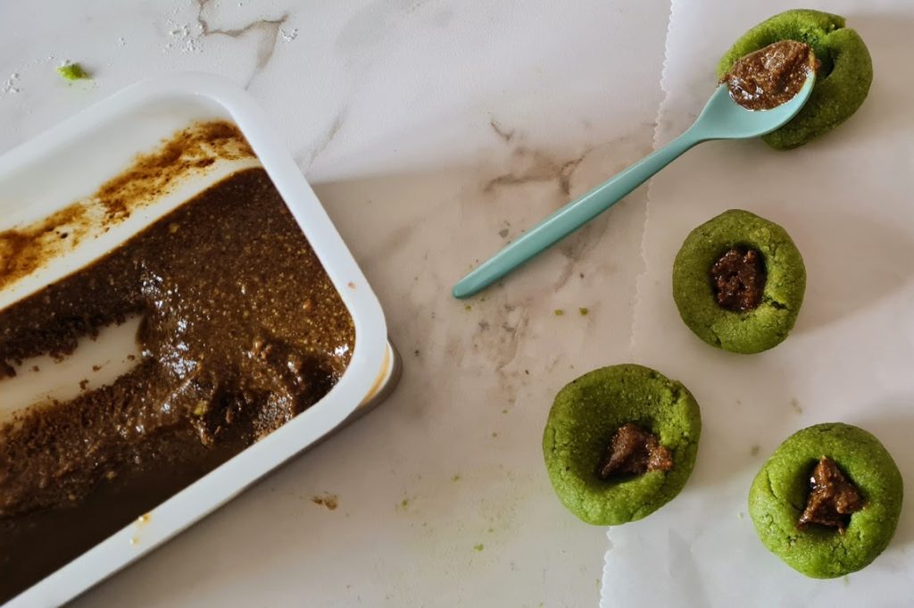 Facultatif : j’ai garni chaque macaron d’un peu de pâte à pistache l’équivalent de la moitié d’une càcafé. Je l’ai fait au moment de façonner la boule.
