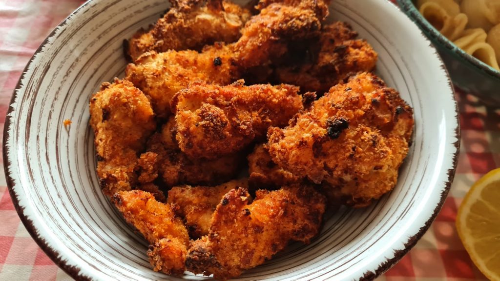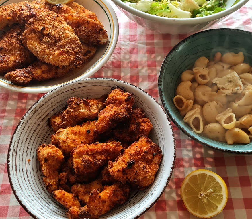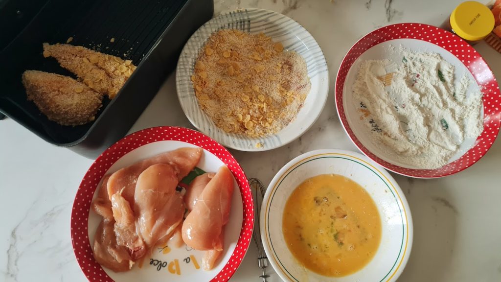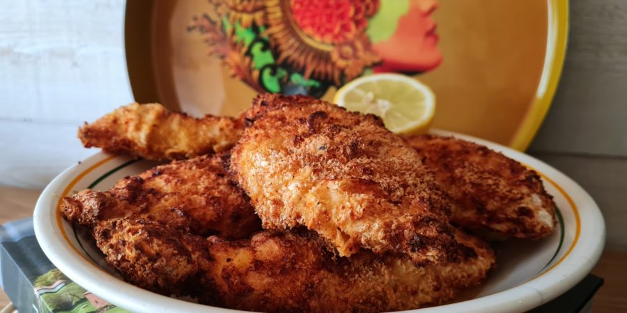 Il faut que je vous confesse, depuis que ma cuisine s’est enrichie d’un l’air fryer, je cuisine différemment. Je fais de l’assemblage, plus de batchcooking. Je cuisine à l’instant T. En une demi-heure le repas est préparé et cuit dans un délai encore plus bref. A la maison on rêvait de poulet pané… Exit la friture, le croustillant est là, l’intérieur du filet de poulet est tendre sans friture !!! Je referai la recette en variant les épices. Voici donc une recette gourmande à souhait !