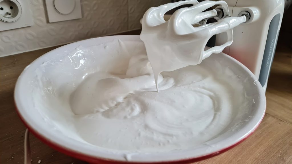 Faire monter les blancs d’œufs au batteur équipé d’un fouet, puis ajoutez la moitié du sucre fouettez puis ajoutez la reste du sucre en poudre. Dès que les œufs forment un bec d’oiseau. Retirez le bol du batteur, et incorporez délicatement à l’aide d’une spatule, petit à petit les poudres (sucre glace, farine, poudre de noisettes