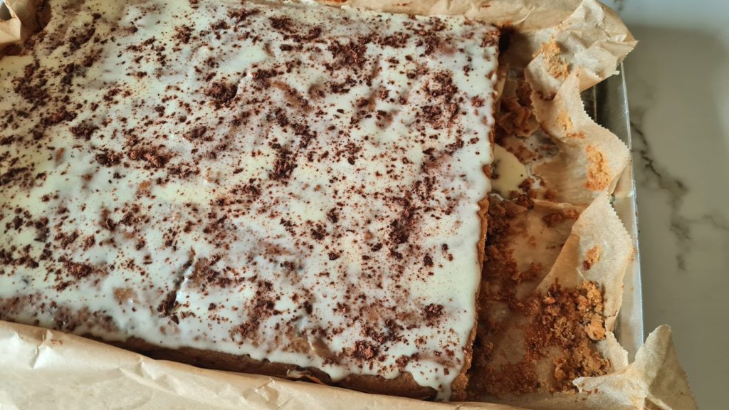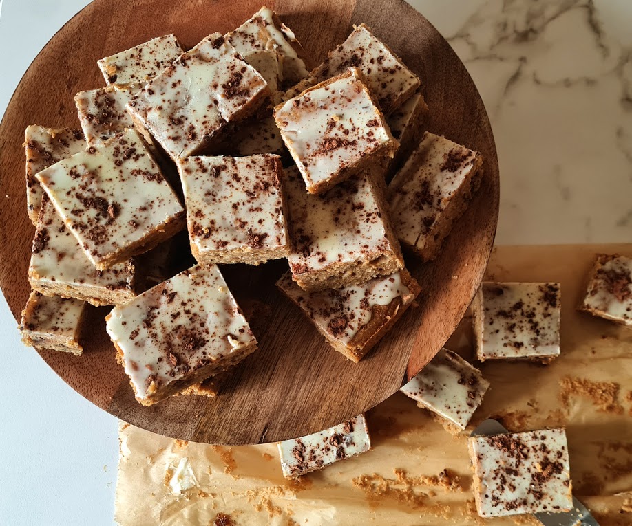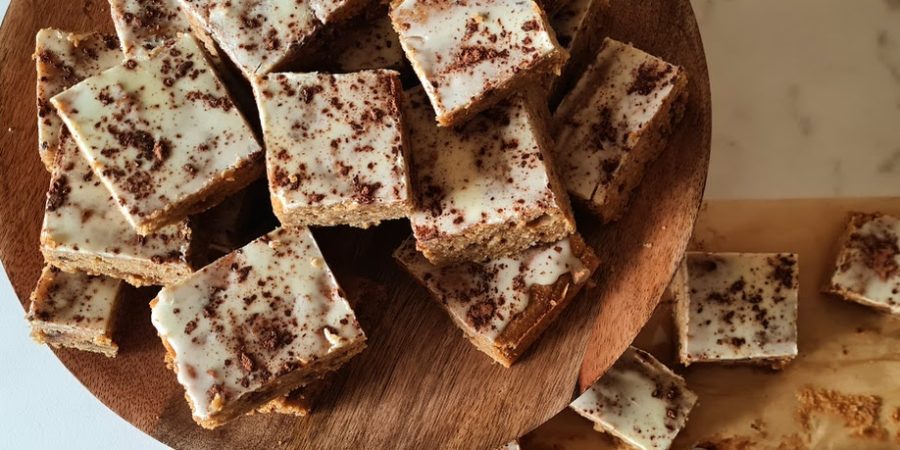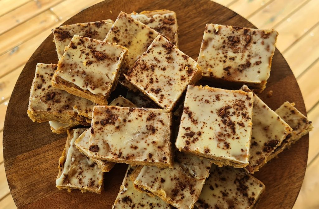 Facultatif : 120 g de chocolat blanc fondu avec 2 càsoupe d’huile de tournesol et étaler à l’aide d’une spatule en laissant refroidir au frais. Découpez lorsque le chocolat aura figé et entreposez dans une boîte qui ferme hermétiquement.