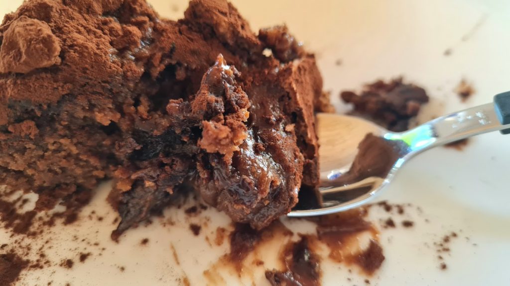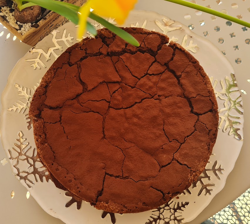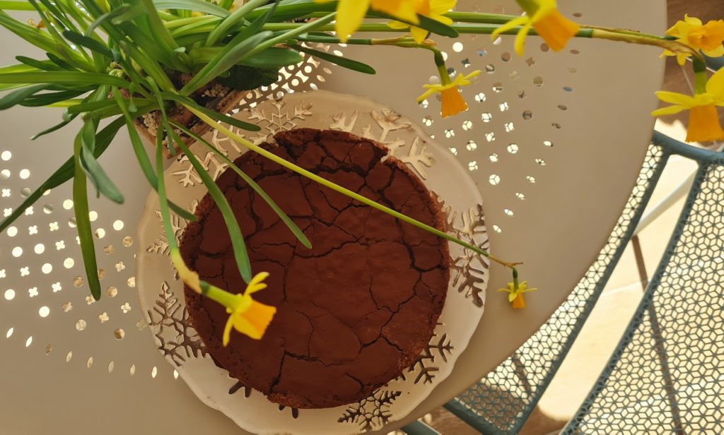 J’avoue que lorsque j’ai lu le détail de la recette, j’ai cru défaillir face aux 200 g de beurre…le grammage du chocolat …rha là là toutes ces calories !!! Mais mon dessert étant à emporter chez des amis, je me suis dit que les calories seront partagées. C’est un très bon fondant, riche en goût (tu m’étonnes avec les 400 g de chocolat). Vous constaterez visuellement des fissures pour les éviter choisissez un moule avec charnière pour ne pas avoir à démouler.