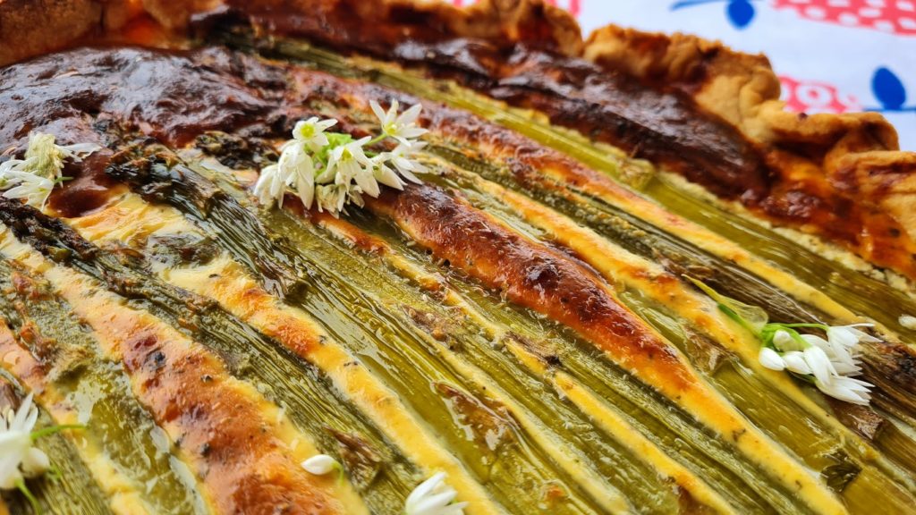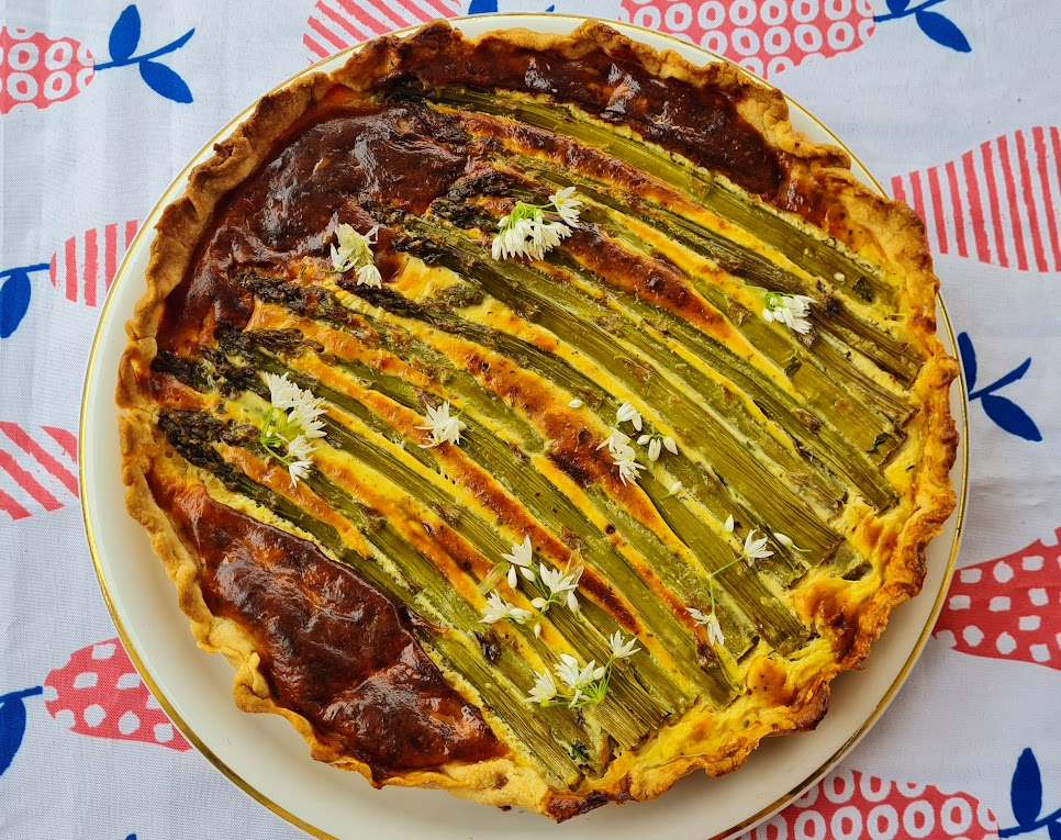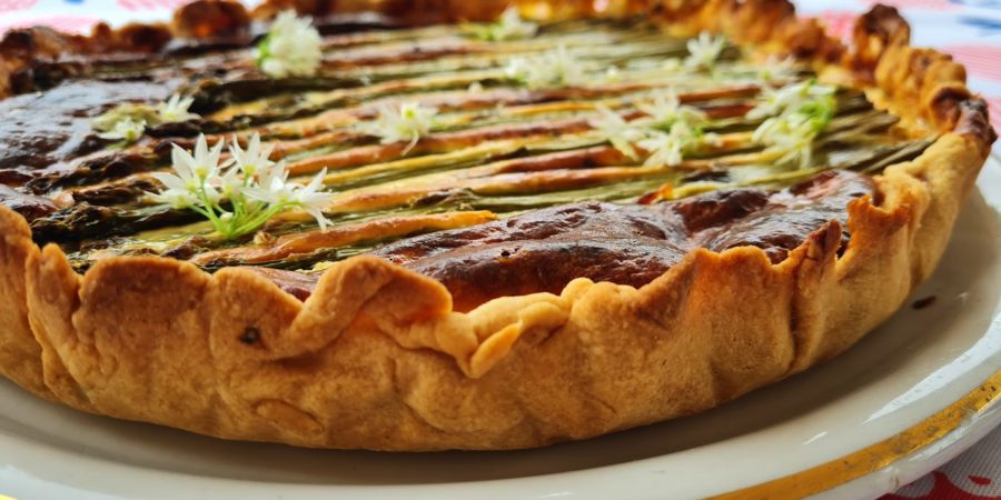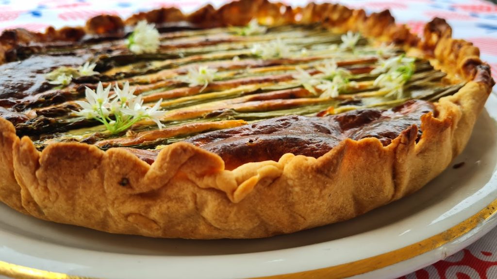 Pour accompagner un velouté d’asperges blanches, j’ai concocté cette tarte salée à base d’asperges vertes, d’Hélène DARROZE. Je n’ai pas précuit les asperges, car j’ai choisi des asperges fines, je les ai juste épluchées et découpées les bouts. J’ai remplacé le brocciu (introuvable par chez moi) par de la ricotta et mis de la crème d’épeautre à la place de liquide entière. La tarte est délicieuse, veillez à respecter le grammage du sel et piment c’est ce qui va relever cette tarte aussi bien bonne chaude qu’à température ambiante.